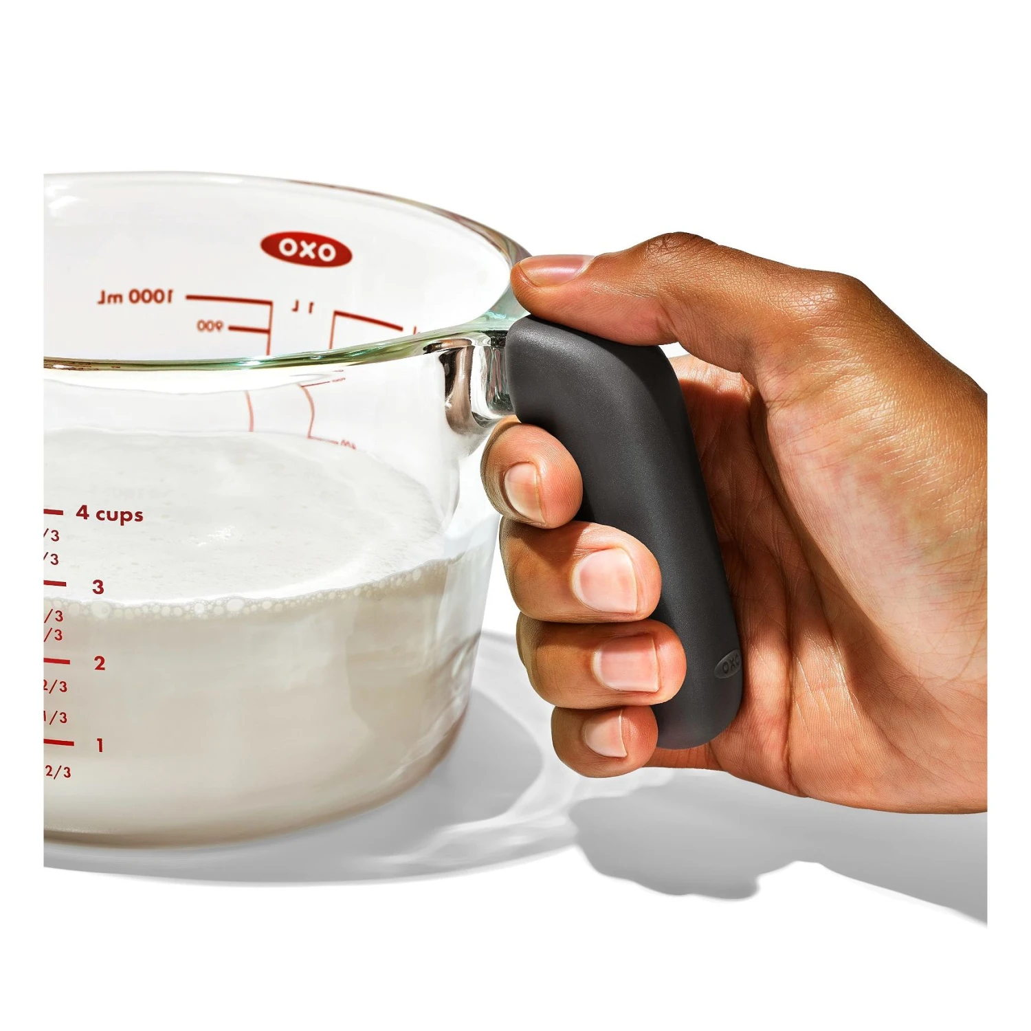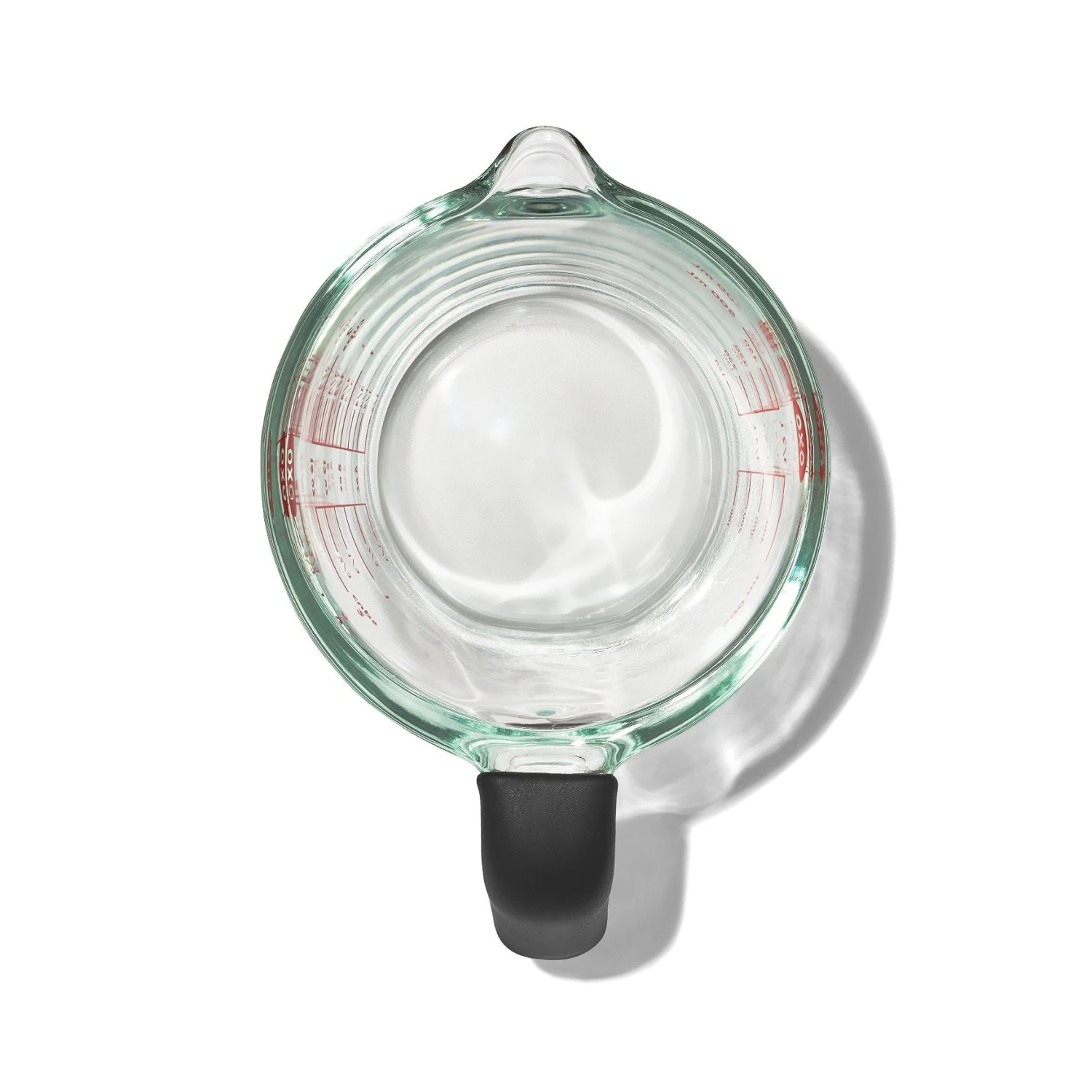 We’ve made measuring, pouring, storing, heating and reheating liquids even easier with the OXO Good Grips 2-Cup Glass Measuring Cup. Not only does it feature our bold, easy to read standard and metric measurement markings, the Cup is made of thermal shock resistant Borosilicate glass so you can take the Cup from the fridge or freezer straight to the oven or microwave without fear of it shattering. That means you can use it to reserve pasta water, heat butter or coconut oil, or reheat a batch of leftover stock or soup. The silicone non-slip handle adds an extra layer of comfort and control as it remains secure in the hand, even if it gets wet. Microwave-, fridge-, freezer- and dishwasher-safe. Also available in 1-Cup, 4-Cup and 2-Cup with lid.
