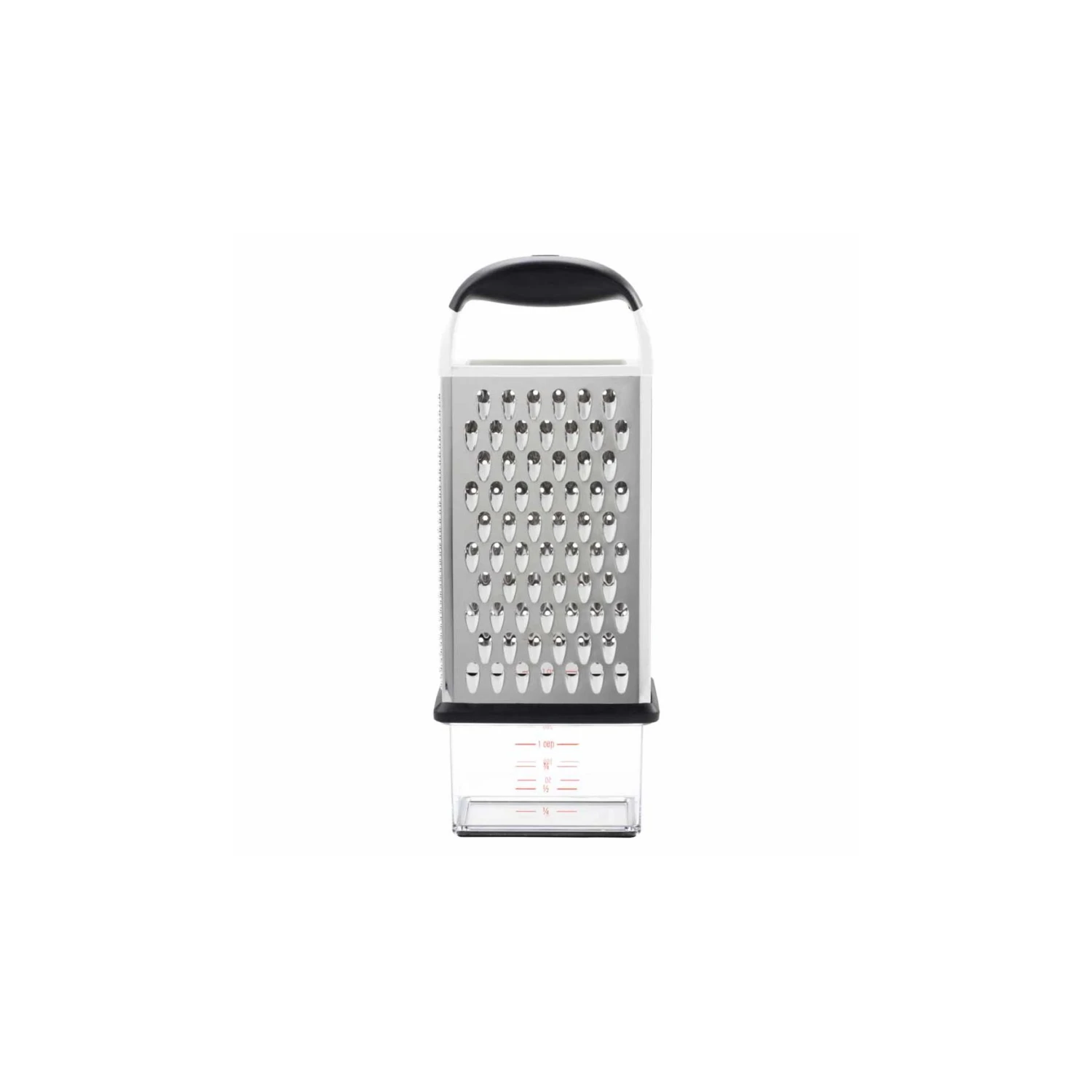 Our Box Grater features 4 stainless steel surfaces: 2 wide ones for coarse and medium grating and 2 slimmer ones for fine grating and slicing. A convenient container with non-slip base, measurement markings and lid attaches to the bottom for catching and storing freshly grated ingredients.
