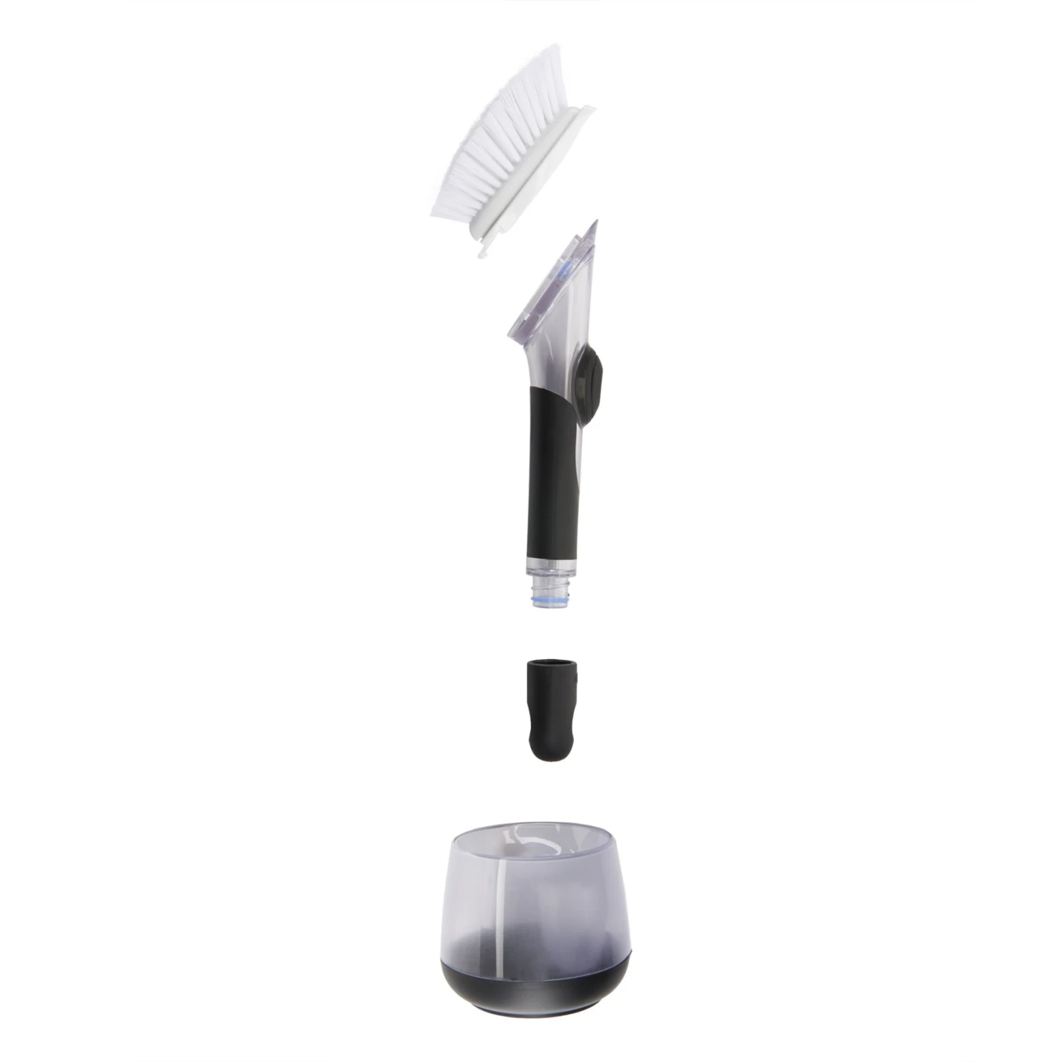 Includes a Soap Dispensing Dish Brush and companion holder, which stores the Brush upright and catches excess water. Holder features a removable drip tray and built-in pour spout. A non-skid base keeps the holder in place. Brush and built-in scraper are safe to use on non-stick cookware.