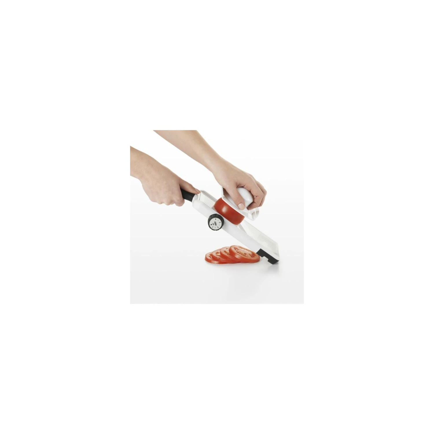 The Large Hand-Held Mandoline Slicer features 7 thickness options, food holder and stainless steel blade for perfect, even slices. The clear surface shows slices accumulating below and the wide ramp accommodates a variety of vegetables. Non-slip notches allow for slicing directly over bowls.