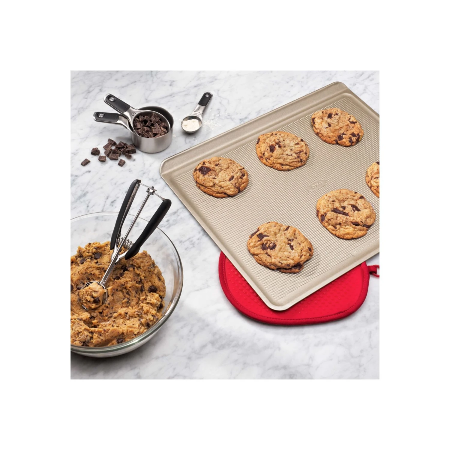 This size 40 portioner is designed for easy scooping and consistent shaping. The soft grip absorbs pressure while you squeeze to smoothly release your cookie dough. Dishwasher safe. Also try our Small and Large Cookie Scoops.