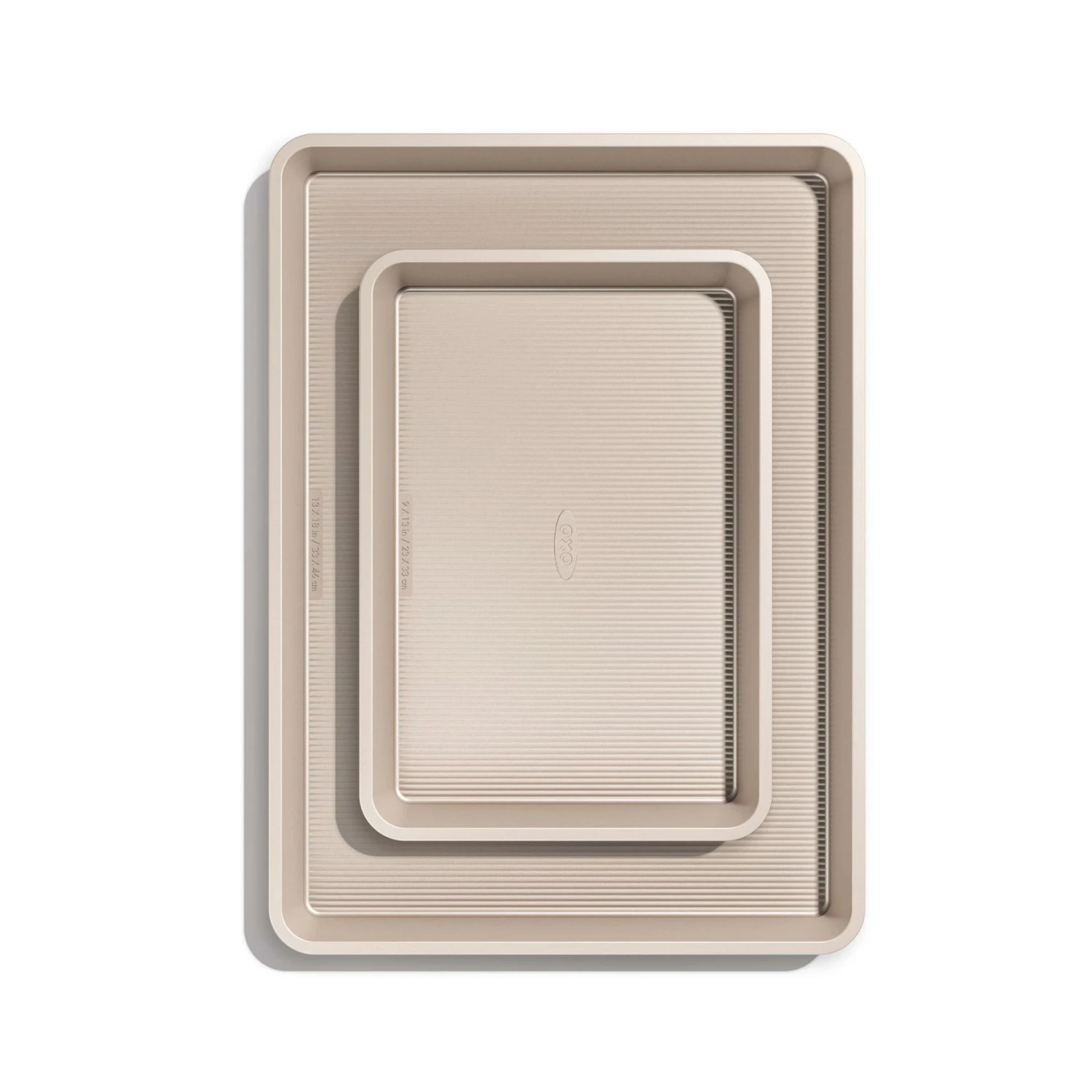 The OXO Good Grips Non-Stick Pro Metal Bakeware 2-Piece Sheet Pan Set provides versatility for baking and roasting. The Set includes one Half Sheet Pan, perfect for baking a dozen cookies, and one Quarter Sheet Pan, ideal for roasting a couple filets of salmon. Made in the USA, OXO Metal Bakeware brings you the same best-in-class quality and performance found in commercial bakeware. The Set is constructed from heavy-gauge aluminized steel for stability, even heat distribution and durability for years to come. The Swiss-engineered, ceramic-reinforced, two-layer coating allows for easy food release while protecting against scratching, staining and corrosion. The micro-textured pattern minimizes the Pans’ contact with food for more airflow and even baking. The square-rolled edge adds structure and provides a secure grip. Hand wash only.