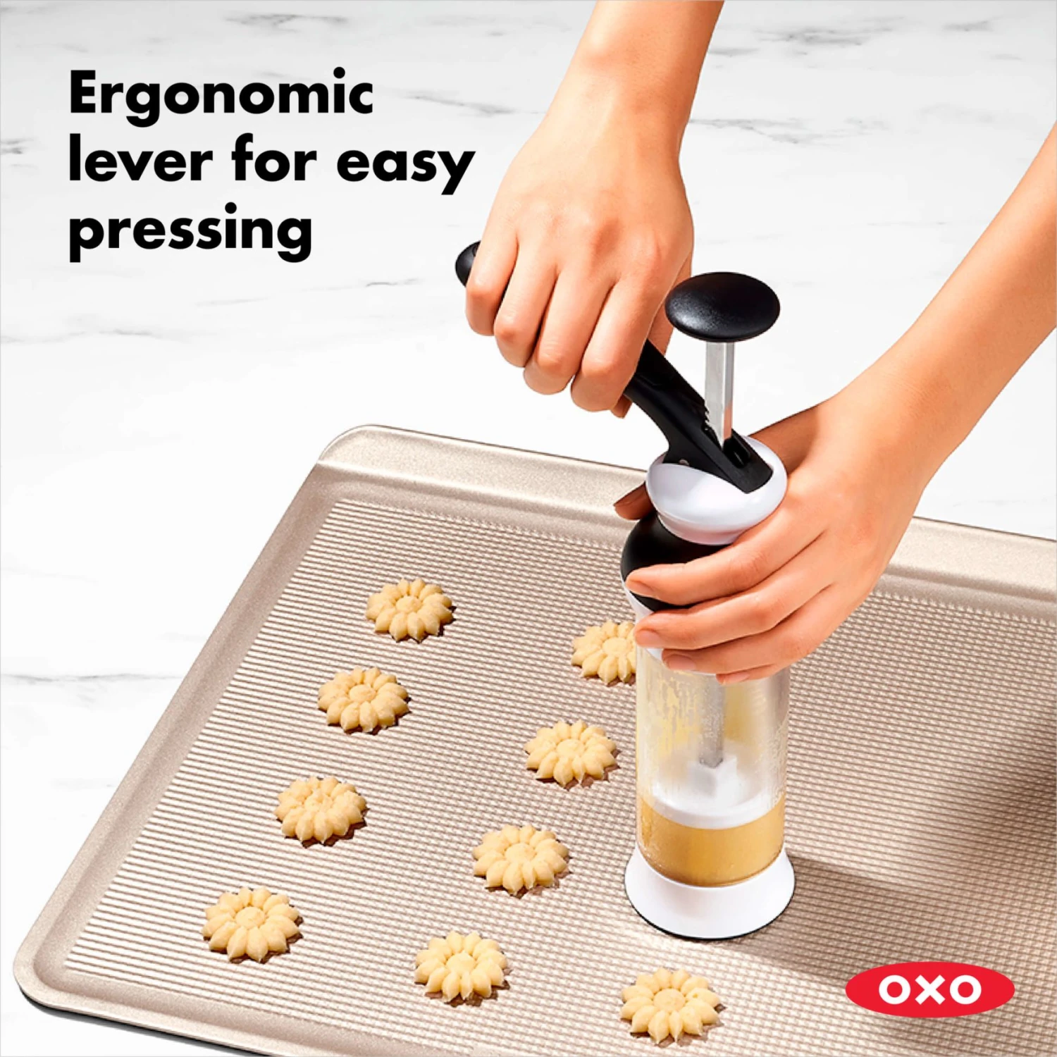 Make consistently shaped cookies with a simple pump of the large, comfortable lever. Disassembles for easy loading and cleaning. 12 stainless steel patterned disks included: Daisy, Flower, Sunflower, Fleur-de-lis, Butterfly, Bear, Shell, Leaf, Heart, Snowflake, Tree and Wreath.