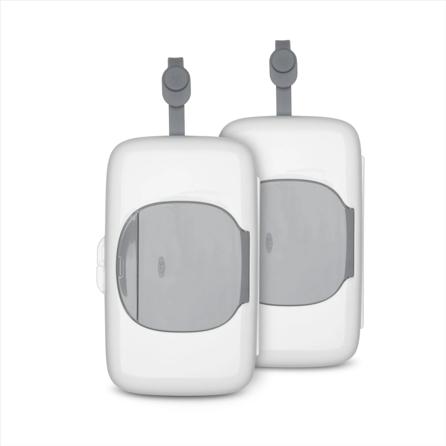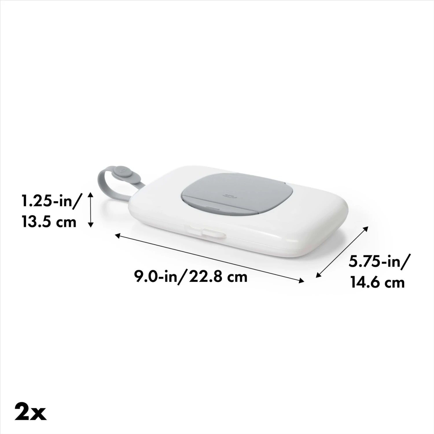 The OXO Tot On-the-Go Wipes Dispenser is perfect for keeping wet wipes within reach while traveling. Push the large button to reveal a large opening, offering easy access to your preferred brand of wipes. A handy silicone strap attaches directly to strollers and diaper bags, or tuck the slim Dispenser into your bag or purse. BPA-free body. Set of two so you can have one in the car and one in the diaper bag.Features Keeps wipes close for on-the-go access Large button for easy one-handed opening Silicone tether secures Dispenser to strollers or diaper bags Generous opening offers easy access, dispenses one wipe at a time Slim shape tucks neatly into most bags; 2-pack means you can have one in the car and one in the diaper bag BPA-free body