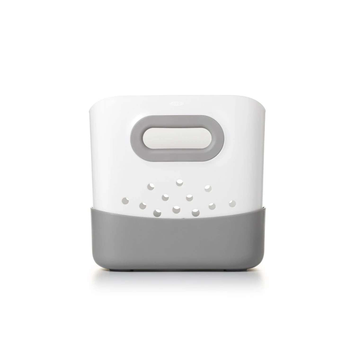 Keep baby’s bath toys contained with the OXO Tot Stand Up Bath Toy Bin. The 7.1 L capacity can handle everything from rubber duckies to toy boats and carefully sized hole pattern will dry them quickly. Soft, comfy handles make scooping up toys a cinch, and the elevated tray will catch any drips while drying. The Bin has a non-slip base for sturdy, upright storage. Bin and base separate for thorough cleaning. Dishwasher safe. PVC- and adhesive-free.