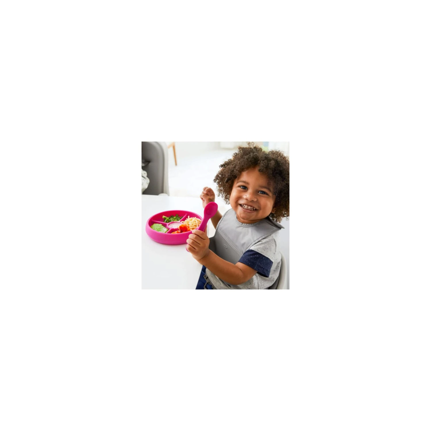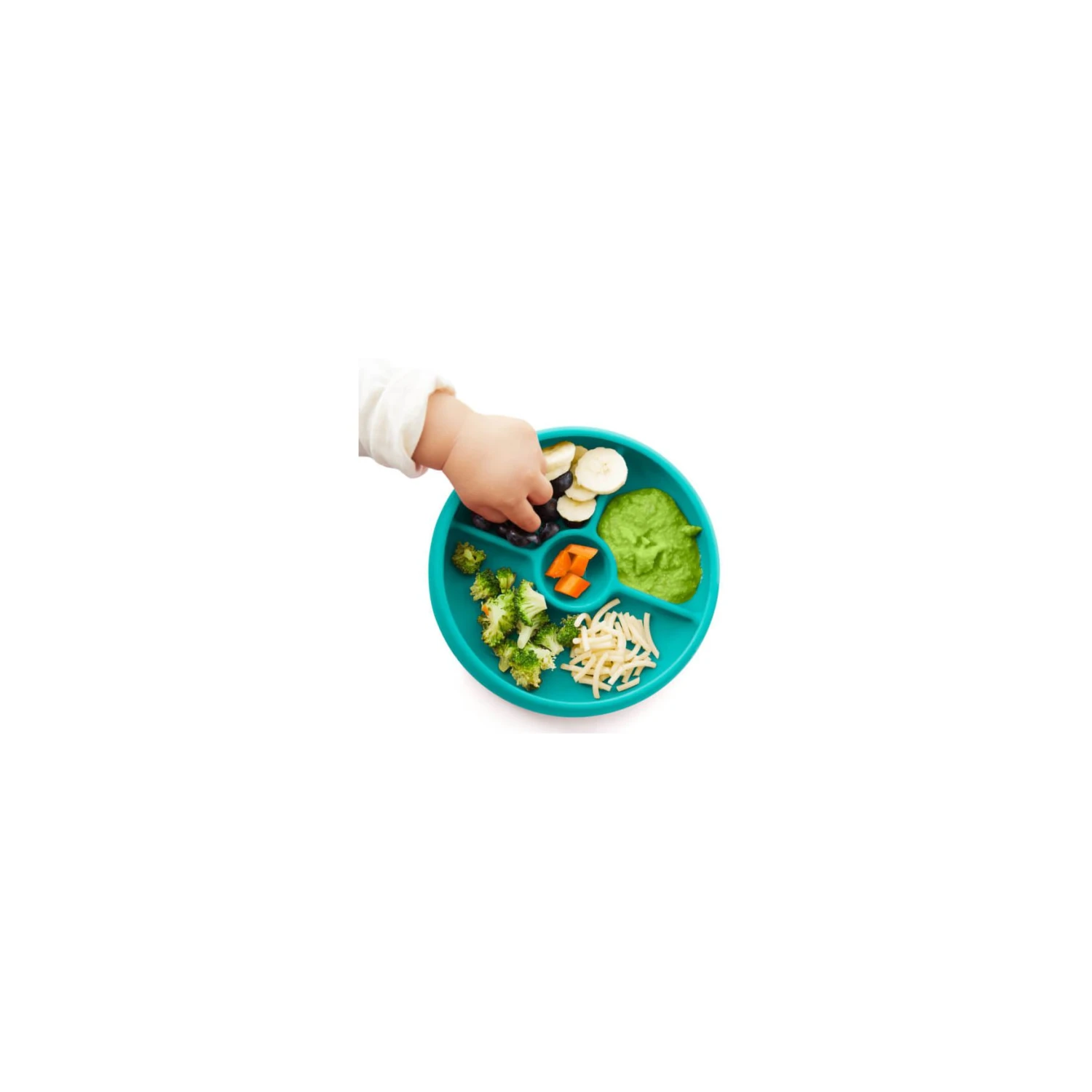 This Silicone Divided Plate helps toddlers learn to feed themselves while keeping foods separated. Made entirely of BPA-free silicone, the divided plate features a weighted base that helps prevent accidental tipping or sliding. Tantrum-proof construction won’t crack or chip, no matter how much your tot tries. The high walls of the plate curve inward to help toddlers successfully scoop food into spoons, while the center compartment is perfect for dips. This divided plate is designed specifically for little hands to grasp with ease. Dishwasher and microwave safe.