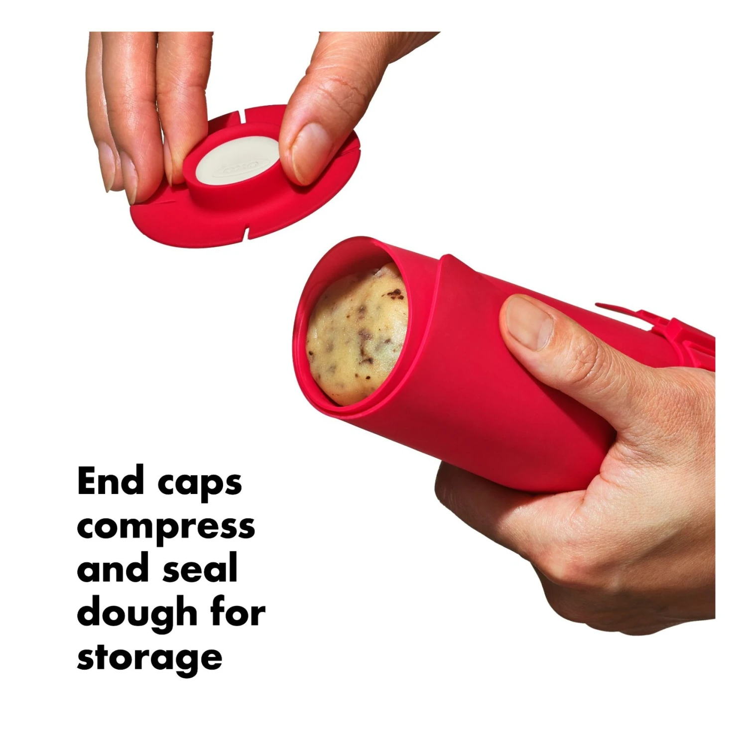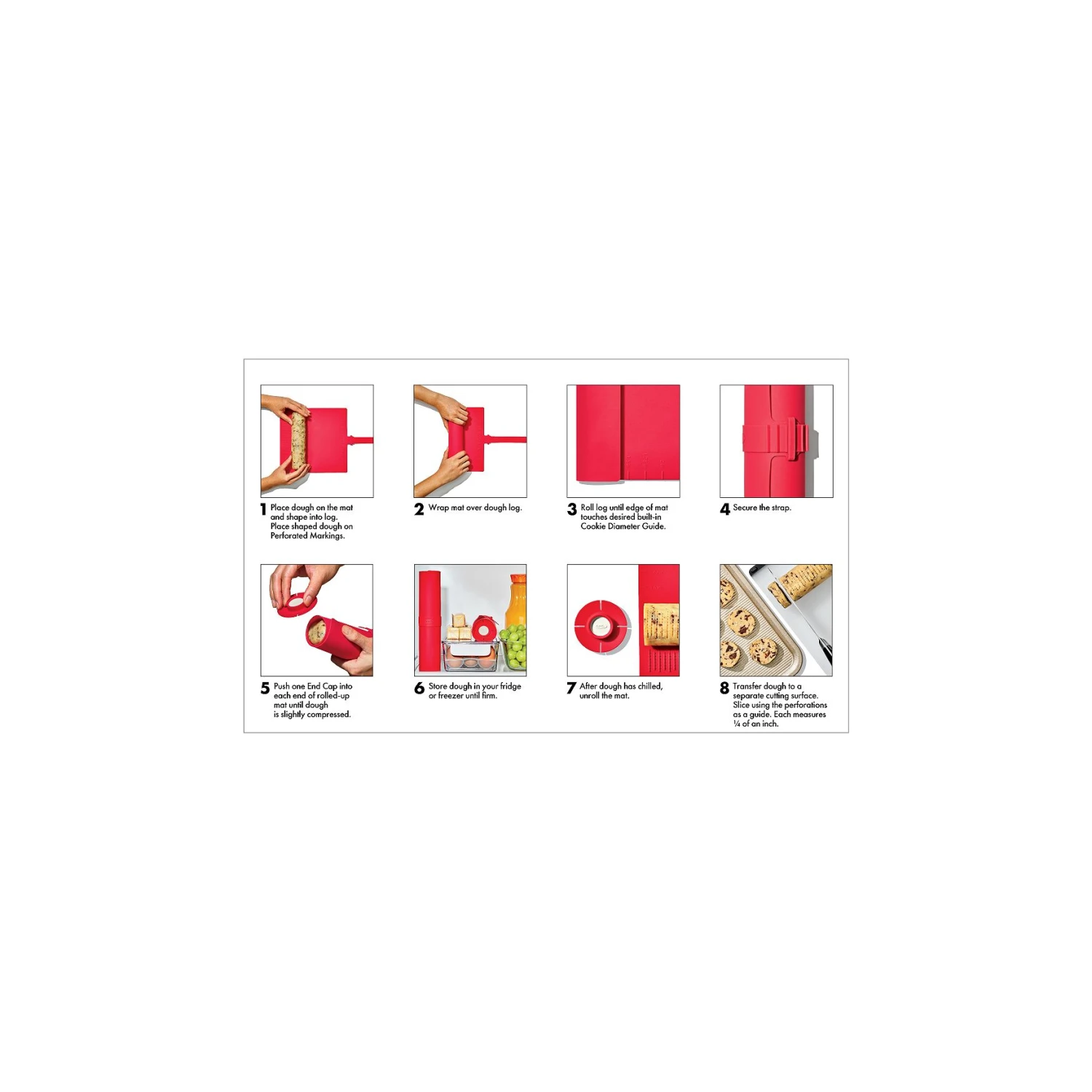 Icebox cookie are a favorite among home bakers since they bake up fast, but we know the forming and chilling of the dough can be tedious. With the OXO Slice + Bake Cookie Helper, we’ve set you up for success! Our set of two handy silicone mats helps you shape, pre-measure and store cookie dough with ease. Once your dough is formed, our mat does the rest—simply lay down your dough and shape into a log. Rest the log on the side with our raised markings that will gently perforate your dough so that once it’s chilled you have an easy guide to follow to slice up uniform cookies. Use our built-in measurement guides on each side of the mat to form your dough to either make 1.5”, 1.75” or 2” diameter cookies. Once your dough is rolled up, use the included end caps to compress and seal the dough, secure the strap and your logs are ready to be chilled in the fridge or freezer until you’re ready to slice and bake! Just be sure to move the dough to a proper cutting surface before slicing – never slice on the mat. Mats and end caps are dishwasher safe.