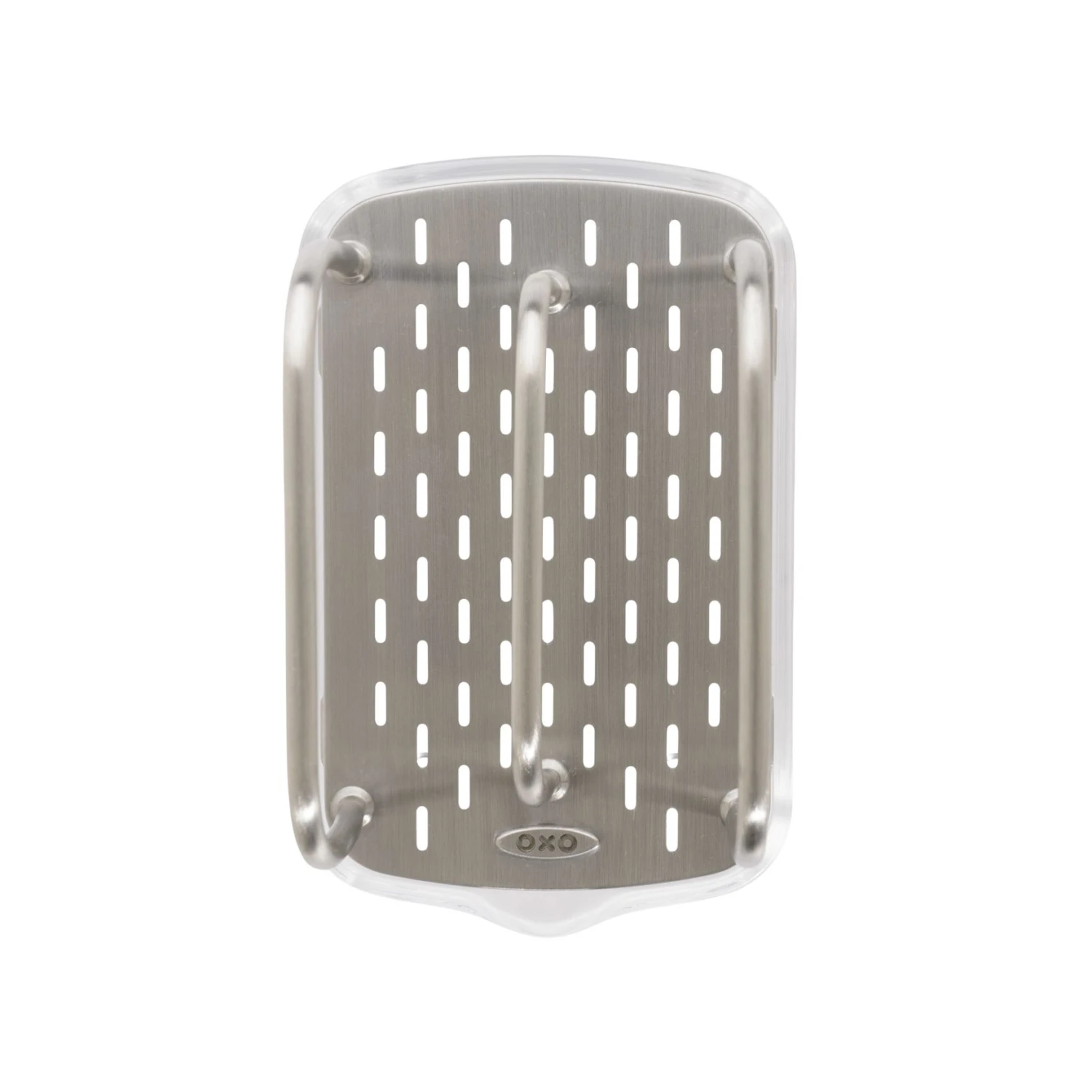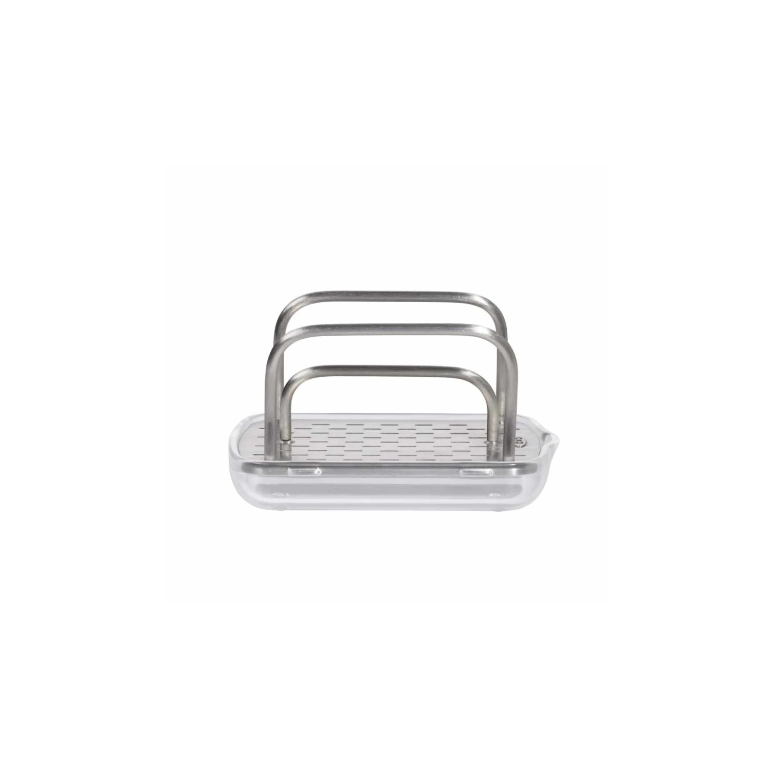 The Stainless Steel Sponge Holder keeps two sponges or scrubs at the ready for washing dishes. Compact design allows it to fit neatly next to the sink without taking up much space. The drip tray is removable for easy cleaning. Open sides and ventilation holes allow for maximum aeration, and the pour spout allows for draining soapy water.