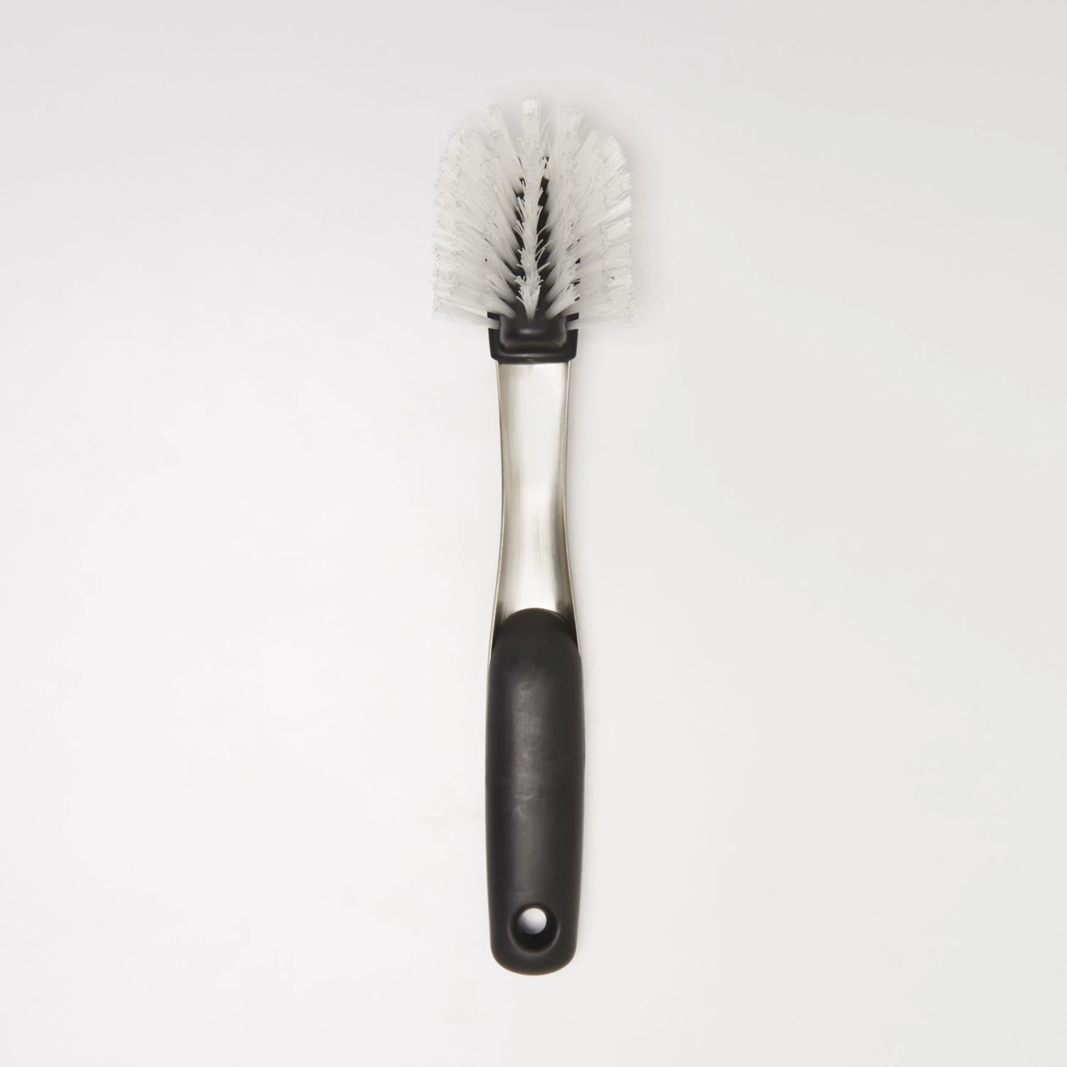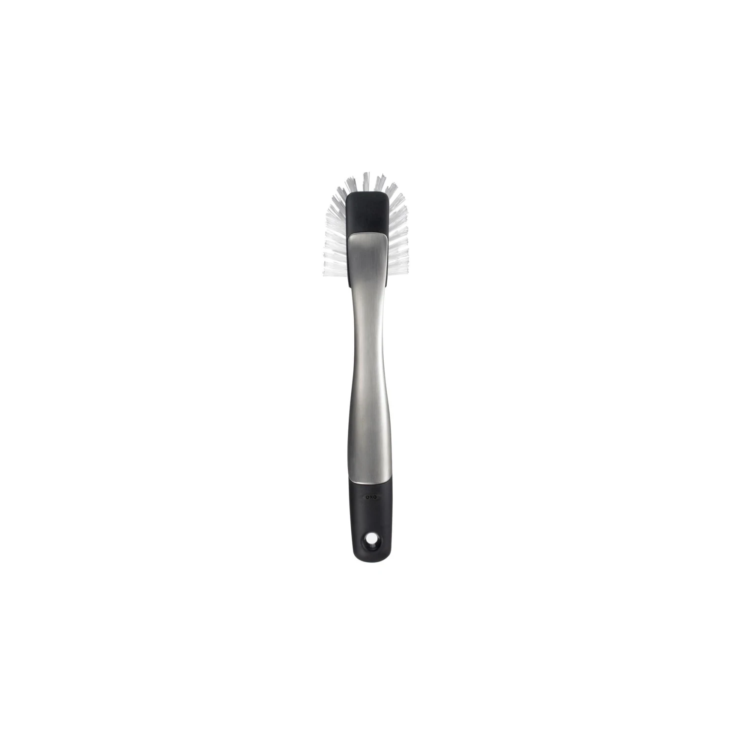 Our SteeL Dish Brush features durable, nylon bristles and built-in scraper. Both are safe for non-stick cookware and help remove baked-on food. Brushed stainless steel body adds a touch of elegance. Soft, non-slip handle provides a secure grip, even when wet. Dishwasher safe.