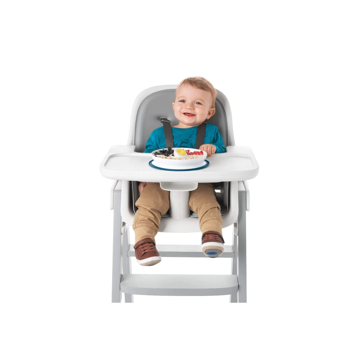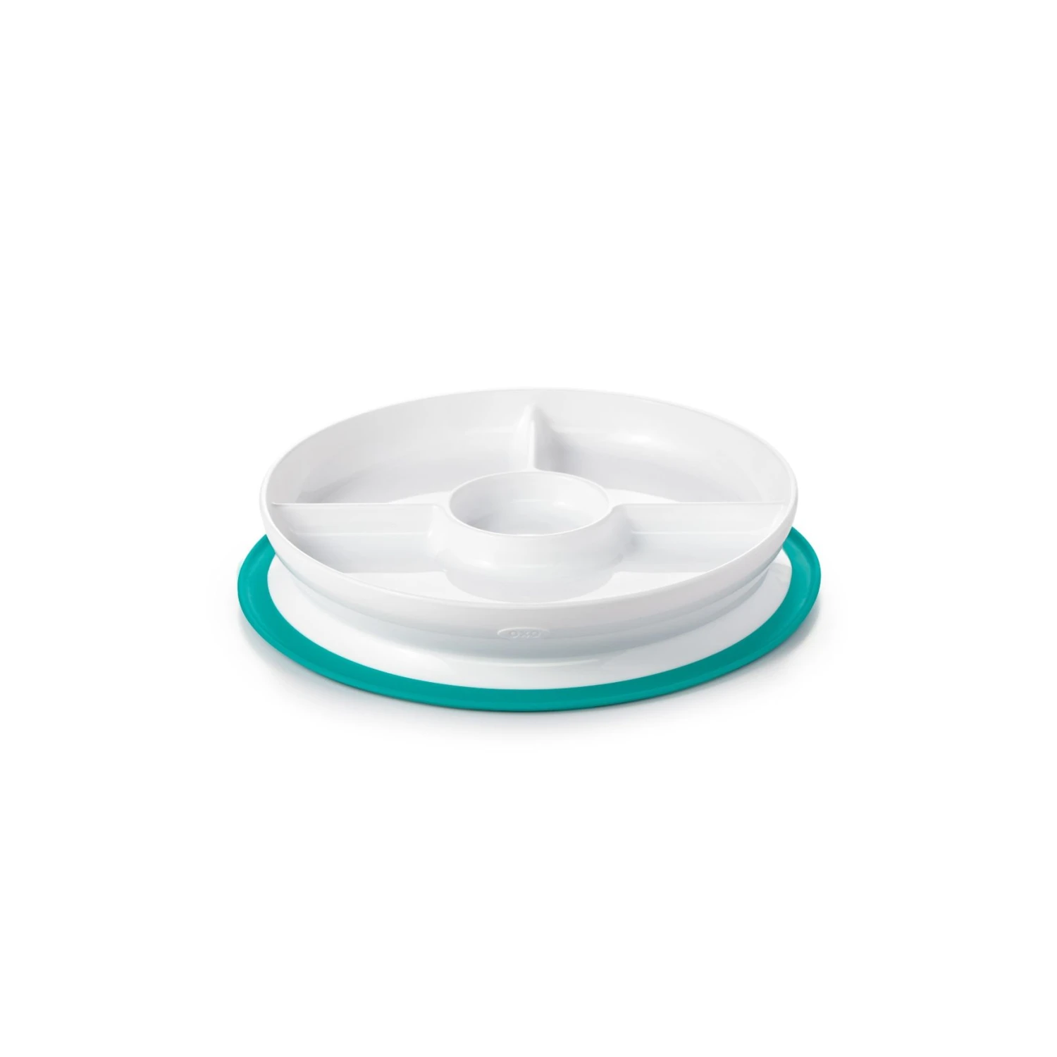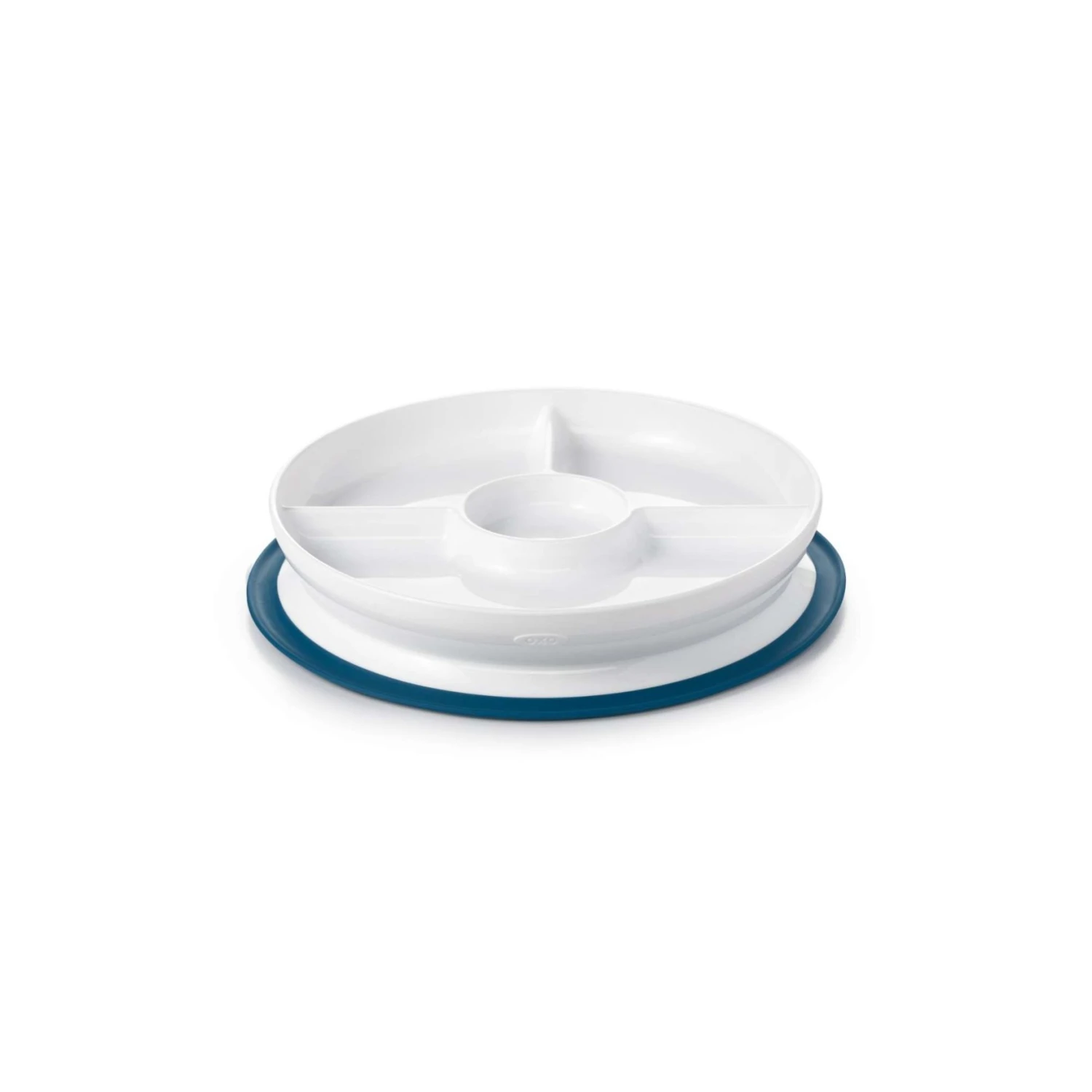 The OXO Tot Stick & Stay Suction Divided Plate has a secure base that sticks on surfaces till mealtime is over. The parent-friendly design is easy for grown-ups to remove, but tricky for tots to budge. That means less slipping, tipping and toppling. The curved side walls promote self-feeding, and four sections (plus a center section for treats) are perfect for portioning. This dishwasher safe Plate and base pad twist apart for thorough cleaning.
