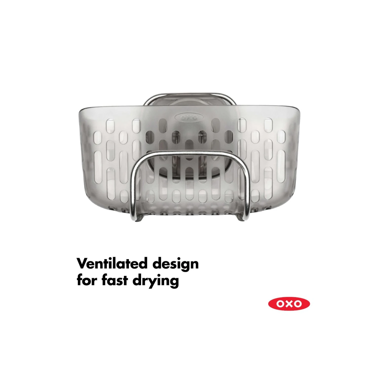 Keep cleaning tools out of sight, but close within reach with the OXO Good Grips StrongHold™ Suction Sink Caddy. Store dishwashing essentials like oversized sponges, dish brushes, steel wool and scrub brushes in the large-capacity basket. We added a stainless steel front hook for resting your favorite dish brush or sponge while you work. The phthalate-free StrongHold™ suction cup locks the Caddy into place with the push of a lever, and the basket can be easily removed from the base to make space in your sink. With a ventilated design for sanitary drying and a dishwasher-safe design, this Caddy keeps your sink, in sync.